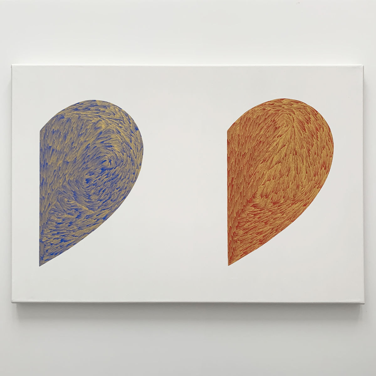 This work consists of two identical shapes. Logically, my response to each should be at least similar. But it is not. It is like assuming that in two identical houses, the course of events within them will also be identical. Perhaps if someone developed an algorithm based on my concept and programmed a robot to fill the shapes, the result would be more consistent. Yet it would not necessarily reflect the human element or the principles of reality.